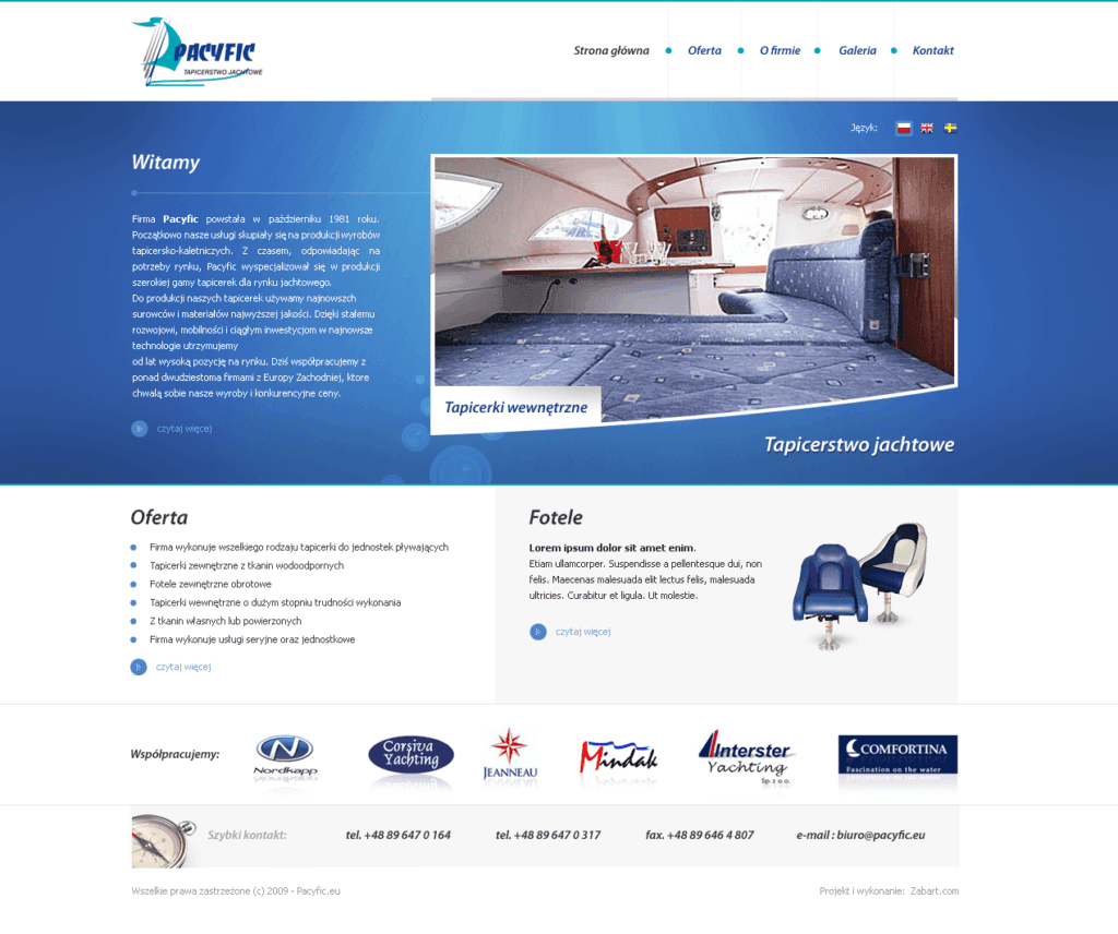 „Już od ponad 35 lat producenci łodzi cieszą się tapicerkami, materacami i fotelami sternika wyprodukowanymi w Pacyfic. W Pacyfic zrobimy, według miary lub według dostarczonego projektu, indywidualnie dopasowaną tapicerkę do każdego rodzaju łodzi. Pomożemy na każdym etapie produkcji i dobierzemy najciekawsze rozwiązania” – czytamy na stronie www.pacyfic.eu